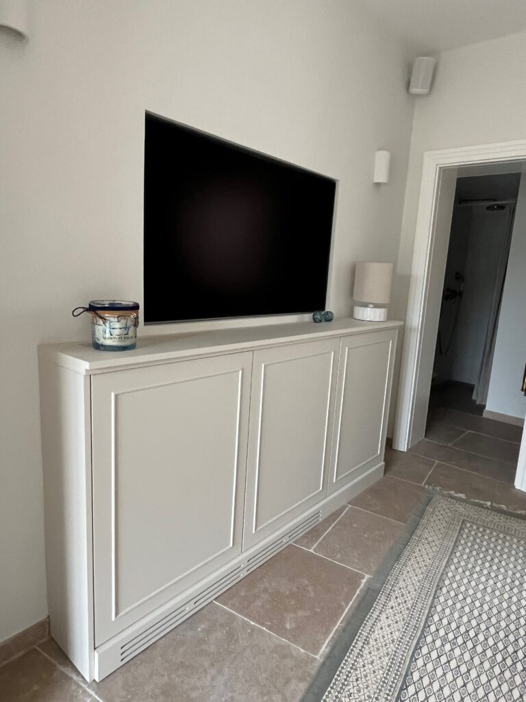 Un meuble TV sur mesure a également été conçu afin d’intégrer discrètement les équipements techniques, notamment la climatisation.