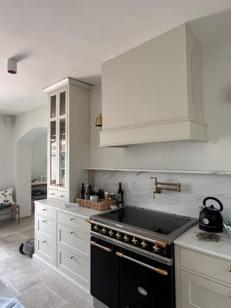 Le mobilier associe des façades élégantes, des plans de travail en pierre et des éléments décoratifs en laiton qui apportent une touche raffinée à l’ensemble.