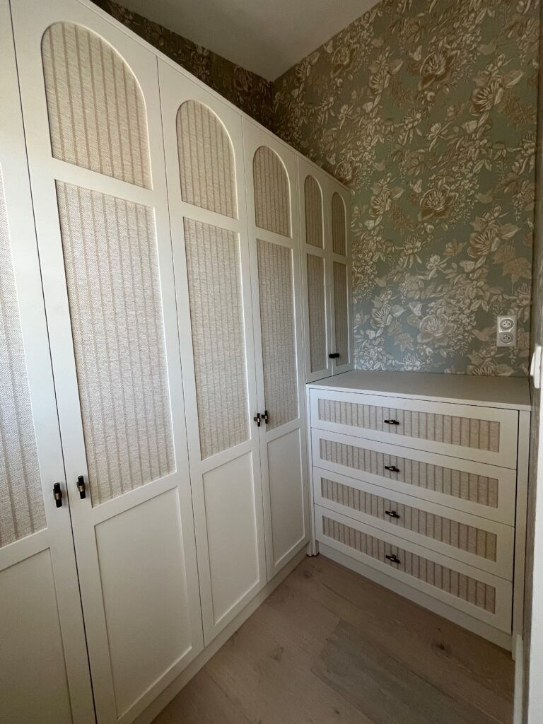 Les rangements ont été conçus pour optimiser l’espace tout en apportant une esthétique élégante grâce à des façades travaillées, des portes avec inserts textiles et des finitions sobres.